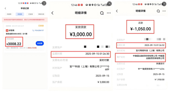 在3000元到账2秒钟后,从银行账户信息的通知里,钱晓看到刚到账的借款被中融国远融资担保有限公司(下称“中融国远融担”)直接划走1050元。银行账户明细详细显示,1050元是“还款”。