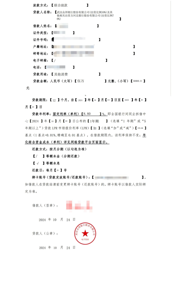 这笔个人消费信贷是由众邦银行(出资比例为30%)和河北银行(出资比例为70%)作为出资方下发的联合贷款。根据众邦银行出示给孙亮的《个人消费贷款合同》(下称“主合同”),这两笔款的借款期限均为12个月(自2024年10月24日至2025年10月24日),还款方式以等额本息方式按月分期,每月24日为还款日,利率为8.8%。