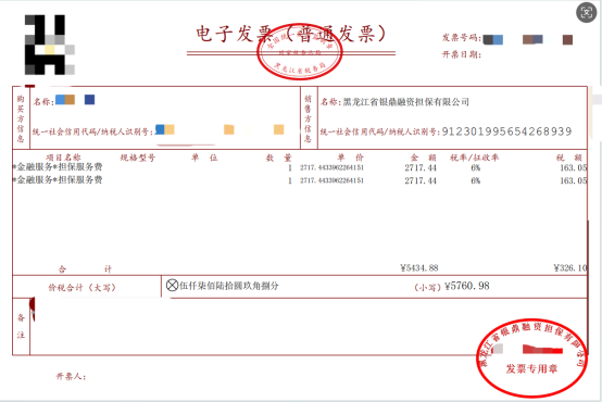他向记者提供的两张开票时间分别为2025年8月18日、8月25日的发票显示,银鼎融担、嘉合兴融担,分别以“*金融服务*担保服务费”与“*现代服务*担保服务费”名义,向他分别收取了5760.98元(含税326.1元)与4604.04元(含税260.61元)。