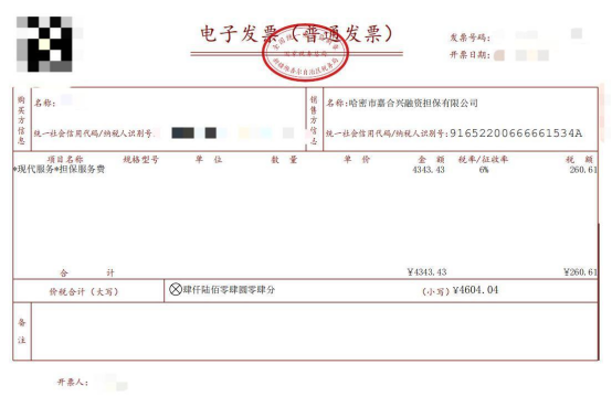 嘉合兴融担向孙亮收取4604.04元的发票信息。受访者供图